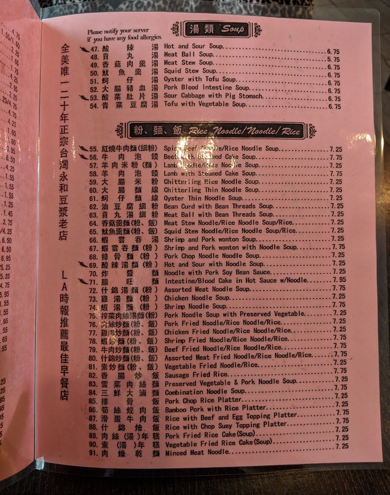 Introducing the menu at Yung Ho Dou Jiang, a go-to spot for traditional Chinese breakfast delights. Located in Alhambra, CA, this restaurant offers a variety of options for both vegetarians and meat lovers. The menu features Dou Jiang, Chinese Long Donuts, and congee with egg and pork/chicken, all praised for their authentic flavors and generous portions. Customers rave about the convenient location, quick service, and warm soy milk in their reviews. With a cozy atmosphere and delicious dishes like fantuan and beef rolls, Yung Ho Dou Jiang is a hidden gem worth exploring for a satisfying breakfast experience.